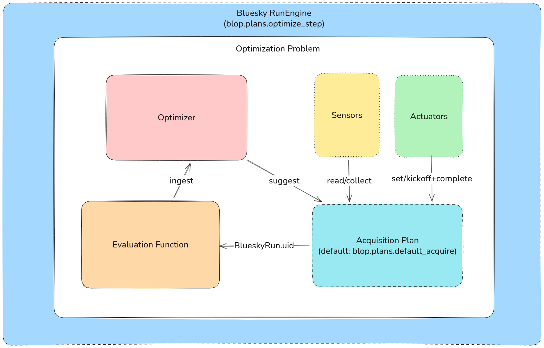 This protocol design allows you to pick and choose only the components you care about with regard to your optimization workflow. While Blop provides a default optimizer and acquisition plan, you are free to implement your own!