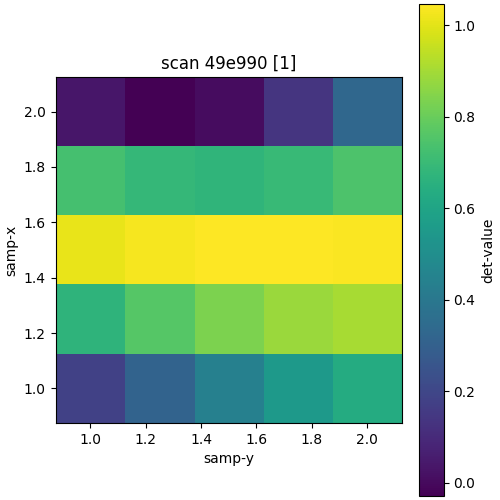 In [6]: <grid_scan([det], samp.x, 1, 2, 5, samp.y, 1, 2, 5)