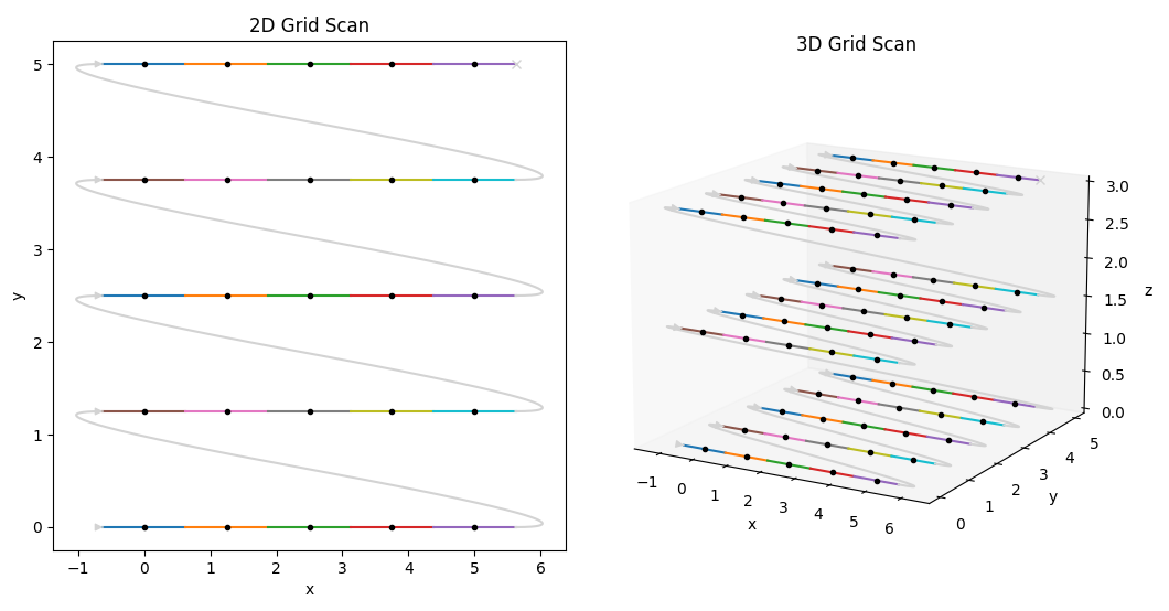 In the example above a 2D grid scan in x and y is repeated in a third dimension: z. Given that z only needs to move for every 1 in every 25 points, it could be synchronized via software rather than hardware without significantly affecting scan time (and saving the effort/expense of wiring it into a triggering system). It then becomes the responsibility of the software to move z, hand control to the external hardware, wait for one grid’s worth of points, take control back, and repeat.