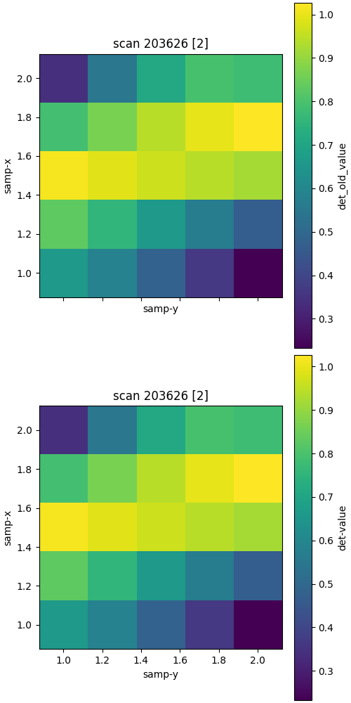 In [9]: <grid_scan([det, det_old], samp.x, 1, 2, 5, samp.y, 1, 2, 5)