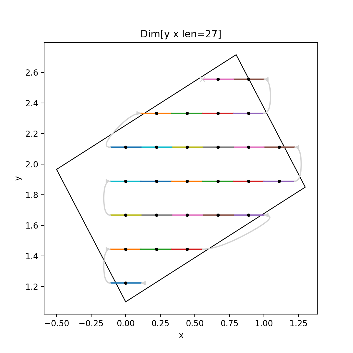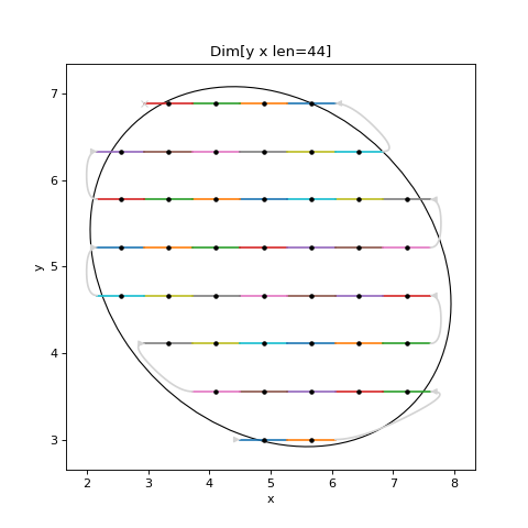Uses a different colour for each frame, grey for the turnarounds, and marks the midpoints with a filled circle if there are less than 200 of them. If the scan is 2D then 2D regions are shown in black.