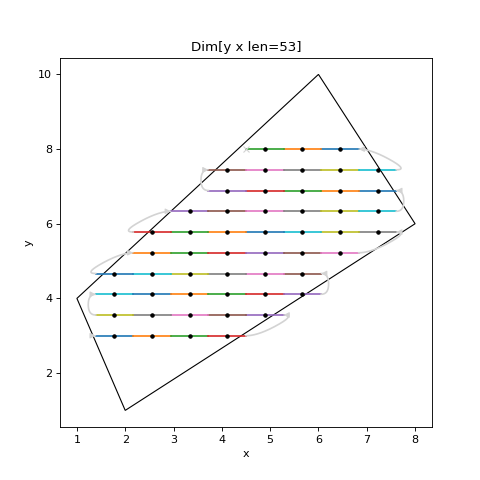 # Example Spec from scanspec.plot import plot_spec from scanspec.regions import Ellipse from scanspec.specs import Line grid = Line("y", 3, 8, 10) * ~Line("x", 1 ,8, 10) spec = grid & Ellipse("x", "y", 5, 5, 2, 3, 75) plot_spec(spec)