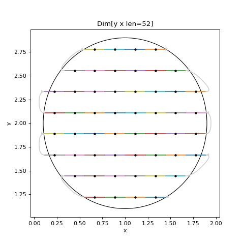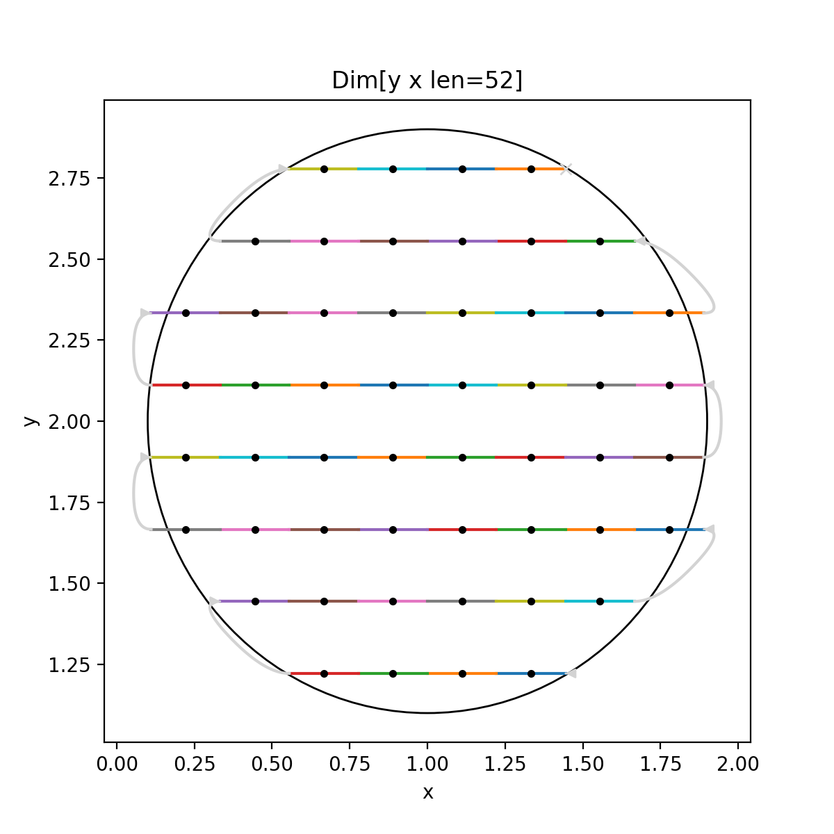 # Example Spec from scanspec.plot import plot_spec from scanspec.regions import Circle from scanspec.specs import Line grid = Line("y", 1, 3, 10) * ~Line("x", 0, 2, 10) spec = grid & Circle("x", "y", 1, 2, 0.9) plot_spec(spec)