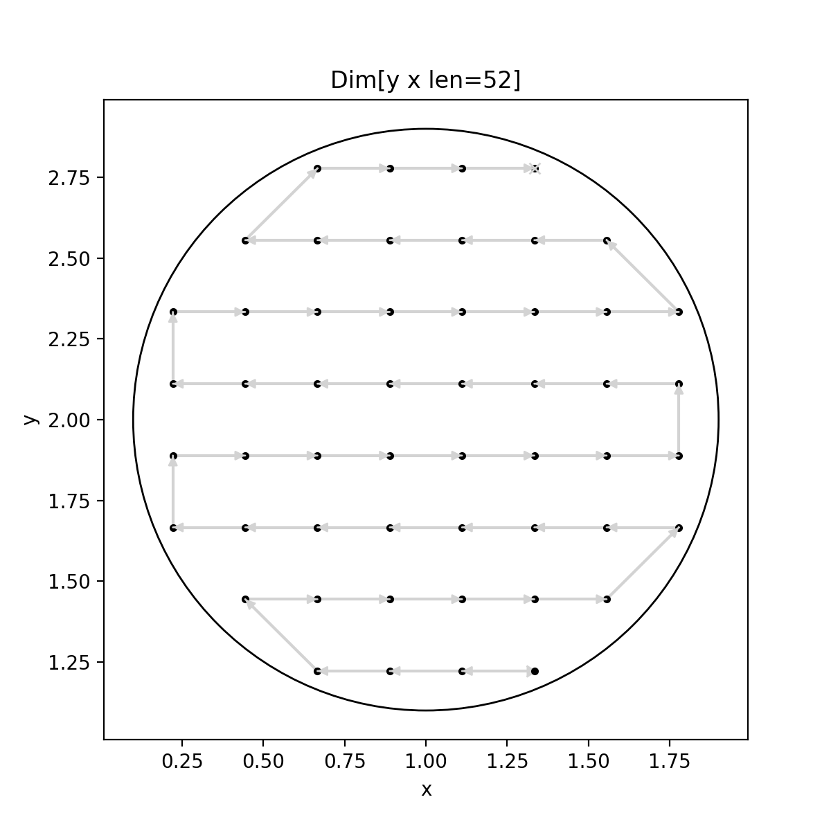 # Example Spec from scanspec.plot import plot_spec from scanspec.regions import Circle from scanspec.specs import Line grid = Line("y", 1, 3, 10) * ~Line("x", 0, 2, 10) spec = grid & Circle("x", "y", 1, 2, 0.9) plot_spec(spec)