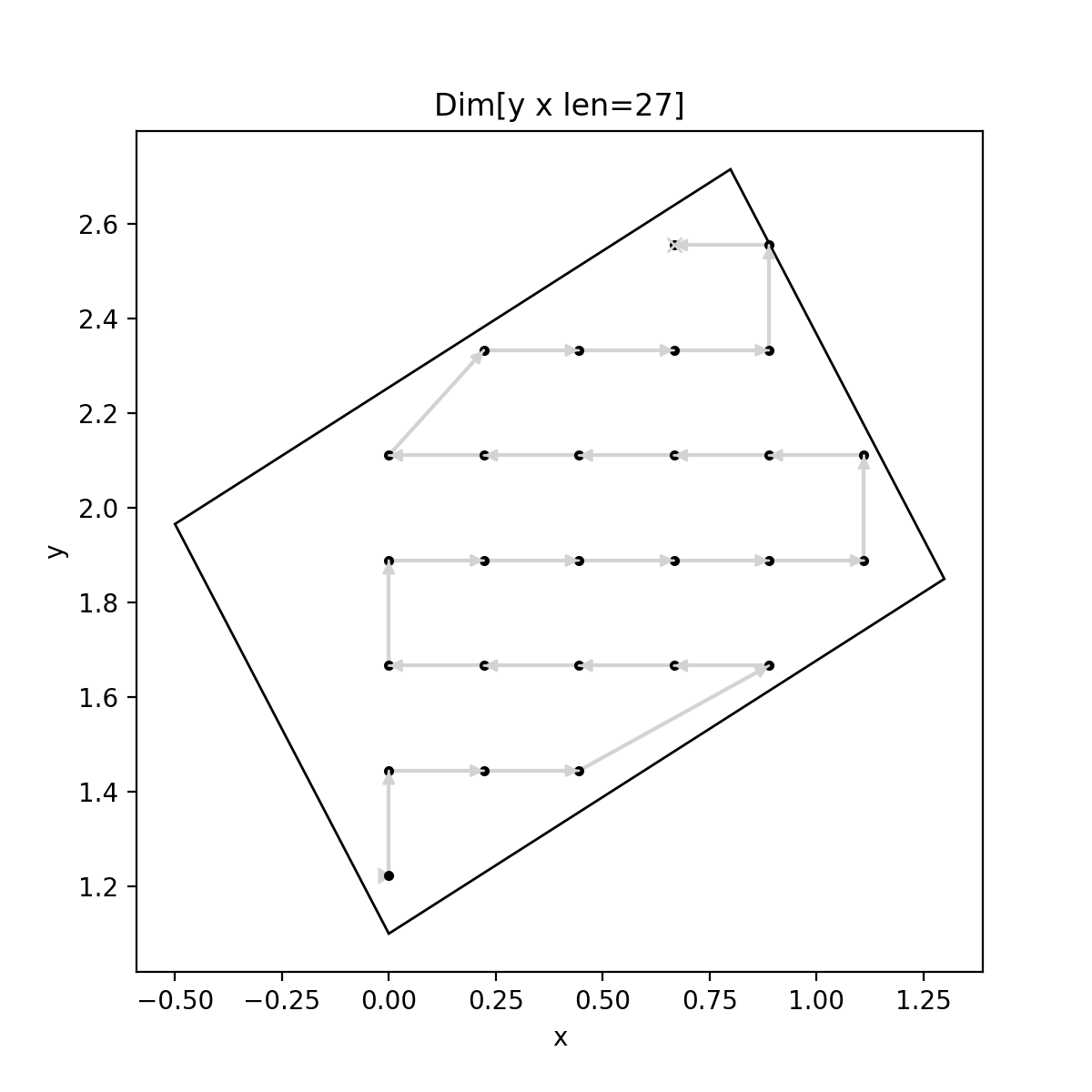 # Example Spec from scanspec.plot import plot_spec from scanspec.regions import Rectangle from scanspec.specs import Line grid = Line("y", 1, 3, 10) * ~Line("x", 0, 2, 10) spec = grid & Rectangle("x", "y", 0, 1.1, 1.5, 2.1, 30) plot_spec(spec)