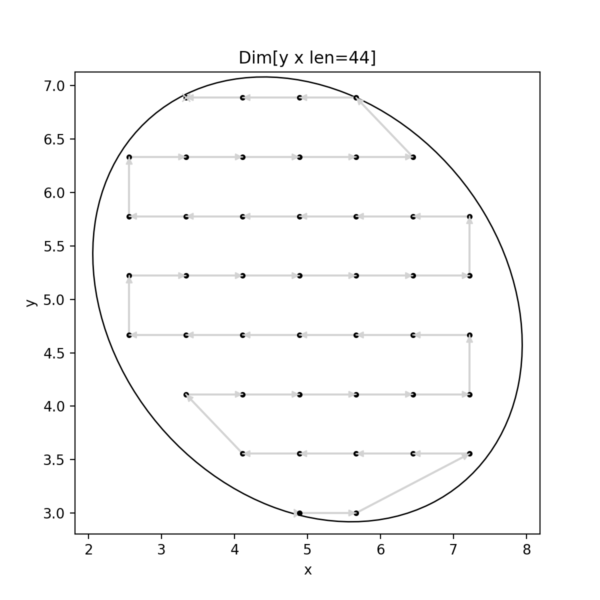 # Example Spec from scanspec.plot import plot_spec from scanspec.regions import Ellipse from scanspec.specs import Line grid = Line("y", 3, 8, 10) * ~Line("x", 1 ,8, 10) spec = grid & Ellipse("x", "y", 5, 5, 2, 3, 75) plot_spec(spec)